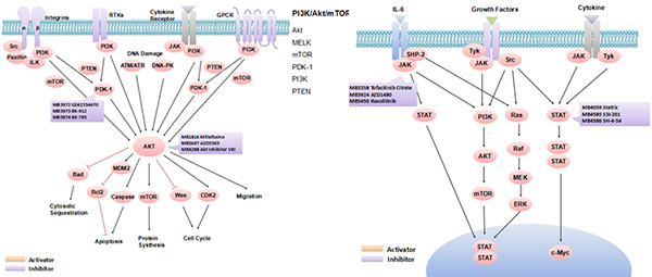信號通路是指當細胞里要發(fā)生某種反應時,信號從細胞外到細胞內傳遞了一種信息,細胞要根據(jù)這種信息來做出反應的現(xiàn)象。信號通路(signal pathway)的提出最早可以追溯到1972年,不過那時被稱為信號轉換(signal transmission)。1980年,M. Rodbell在一篇綜述中提到信號轉導(signal transduction),此后這個概念就被廣泛使用了。信號通路是指能將細胞外的分子信號經(jīng)細胞膜傳入細胞內發(fā)揮效應的一系列酶促反應通路。這些細胞外的分子信號(稱為配體,ligand)包括激素、生長因子、細胞因子、神經(jīng)遞質以及其它小分子化合物等。Meilunbio?可以提供Integrin、 Membrane Transporter 、GPCR/G Protein 、Protein Tyrosine Kinase/RTKs 、Cell Cycle/DNA Damage、 PI3K/Akt/mTOR等數(shù)百個靶點通路,共計3000多種信號通路抑制劑,詳情請參考 信號通路產(chǎn)品選擇指南。