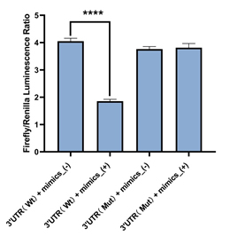 miRNA主要通過作用于靶基因的3’UTR起作用(降解或抑制翻譯),將目的基因3’UTR(野生型和結(jié)合位點突變型)序列構(gòu)建至載體中報告基因F-Luc的3’端,通過比較過表達(dá)miRNA后,報告基因表達(dá)的改變(螢光素酶的活性下降還是不變),來確定miRNA與靶基因3’UTR的作用位點。