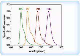 染料 DiD, DiI, DiO 和 DiR 是一類親脂性熒光染料家族,用于標(biāo)記細(xì)胞膜等脂溶性生物結(jié)構(gòu)和疏水性組織。這是一類環(huán)境敏感型熒光染料,當(dāng)它們與膜結(jié)合或者與親脂性生物分子(例如蛋白質(zhì),雖然在水中其熒光強(qiáng)度很弱)結(jié)合時(shí),其熒光強(qiáng)度顯著增強(qiáng)。它們具有很高的淬滅系數(shù),偏光依賴性和很短的激發(fā)壽命。一旦應(yīng)用于細(xì)胞中,這種染料會(huì)在細(xì)胞內(nèi)質(zhì)膜中逐步擴(kuò)散,導(dǎo)致在其最佳濃度條件下,將整個(gè)細(xì)胞膜染色。它們不同的熒光顏色:DiI(橙色熒光)、DiO(綠色熒光)、DiD(紅色熒光)、DiR(深紅色熒光),為活細(xì)胞多色彩熒光成像分析和流式細(xì)胞術(shù)提供了一種便捷的工具。