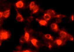 本品配成 5mM 溶液后為紫粉色液體溶液,澄清且無(wú)可見(jiàn)異物; 進(jìn)行熒光染色檢測(cè):工作條件:熒光顯微鏡,C6 細(xì)胞,400×,工作濃度 5μM。 結(jié)果:經(jīng)細(xì)胞膜熒光染色,在40倍物鏡下可看到清晰橙紅色熒光。