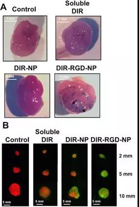 用DIR-RGD-NP界定腫瘤相關(guān)血管 (A) Delineation of tumor vascularity. White light image of tumors showing the outline of tumor-associated vasculature only when dye was administered in RGD-coated nanoparticles; (B) Ex vivo imaging and colocalization of mCherry and DIR signals in dissected tumors (from top: 2mm, 5mm, and 10mm in size). Source: Novel approach for the detection of intraperitoneal micrometastasis using an ovarian cancer mouse model by Alvero et al., Scientific Reports, Jan. 2017.