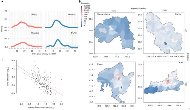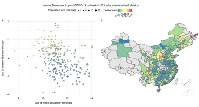 圖2. 擁擠和中國COVID-19傳播的時間聚類,圖片來自Nature Medicine, 2020, doi:10.1038/s41591-020-1104-0。