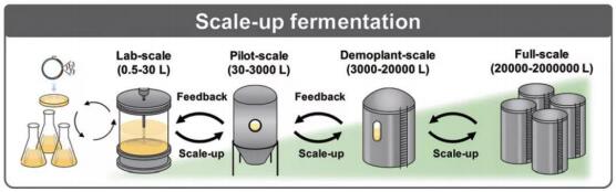 工程師構(gòu)建好微生物細胞工廠后往往只會在實驗室對它進行性能測試,實驗室培養(yǎng)細胞工廠的規(guī)模往往在數(shù)百毫升到30升之間,測試性能達標后,還會在中試規(guī)模繼續(xù)進行驗證,中試規(guī)模培養(yǎng)微生物的反應(yīng)器容積往往在30到3000升之間,但這樣的規(guī)模相對于實際需求還是太小。